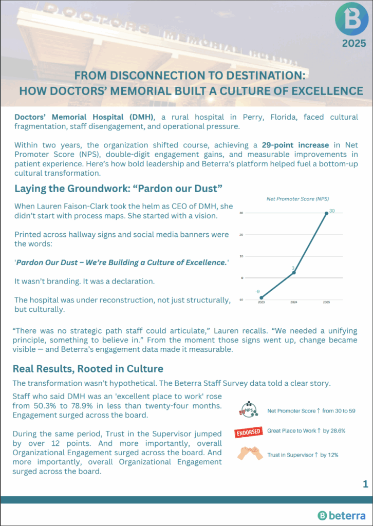 Doctors’ Memorial Hospital (DMH) in rural Florida transformed staff engagement and culture in just two years — with Beterra as a key partner. Under new leadership, NPS increased by 29 points, staff engagement rose by nearly 30%, and trust in supervisors surged. DMH’s story shows how bold leadership and real-time feedback can power measurable cultural change.